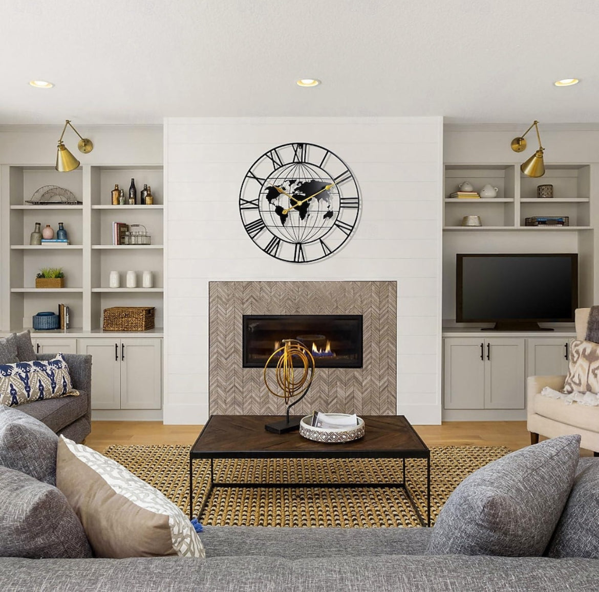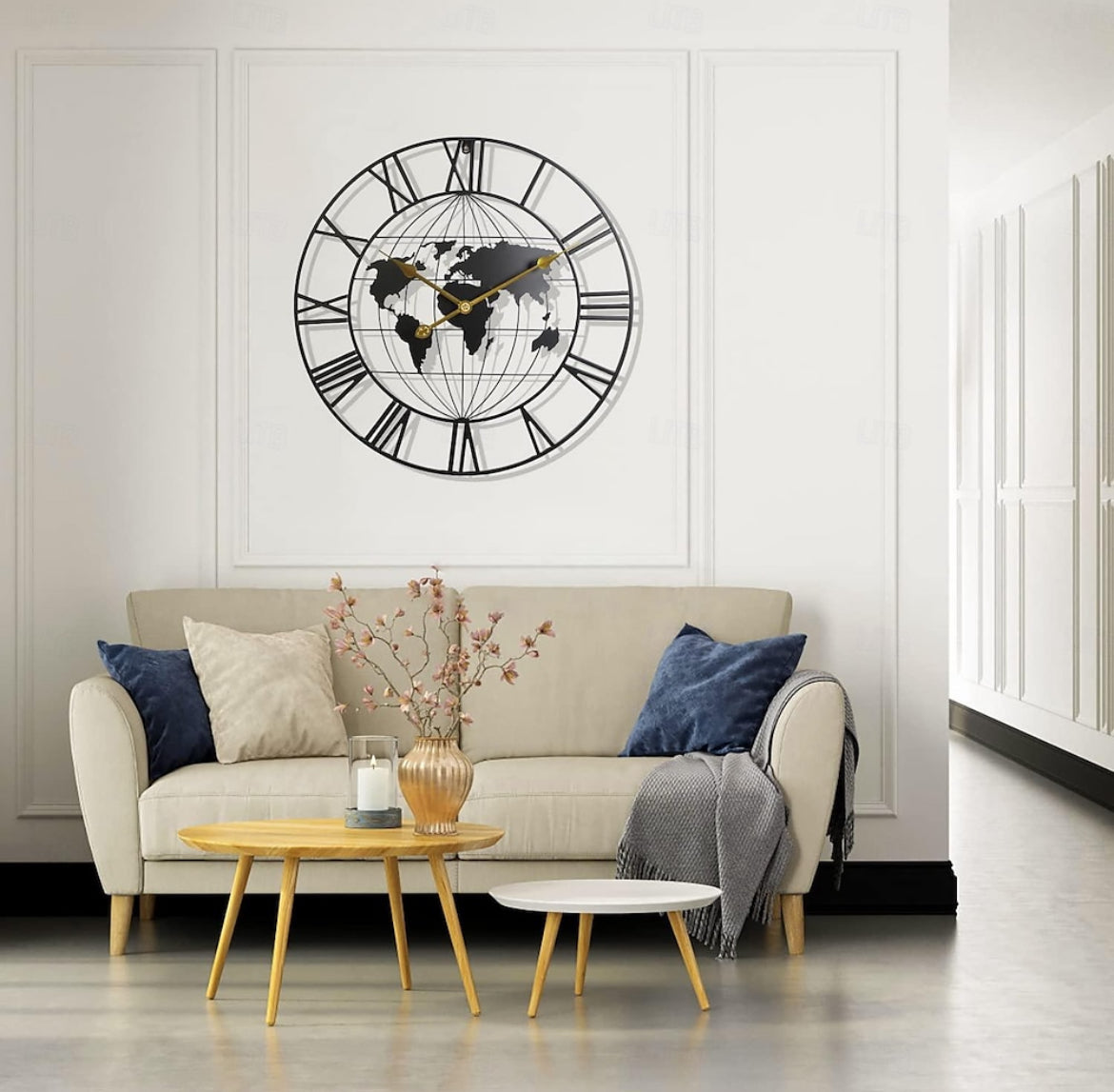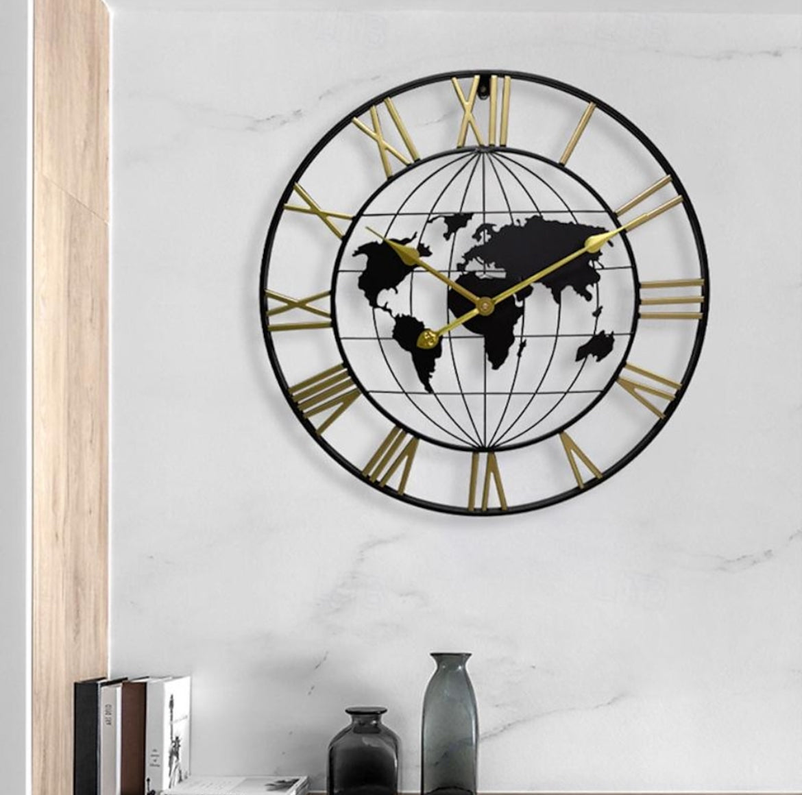Its unique design combines a finely crafted world map 🗺️ with elegant golden Roman numerals ✨, creating the perfect balance between classic elegance and modern style. The contrast of matte black metal 🖤 and gold accents adds a touch of luxury and sophistication, making it ideal for enhancing any space.