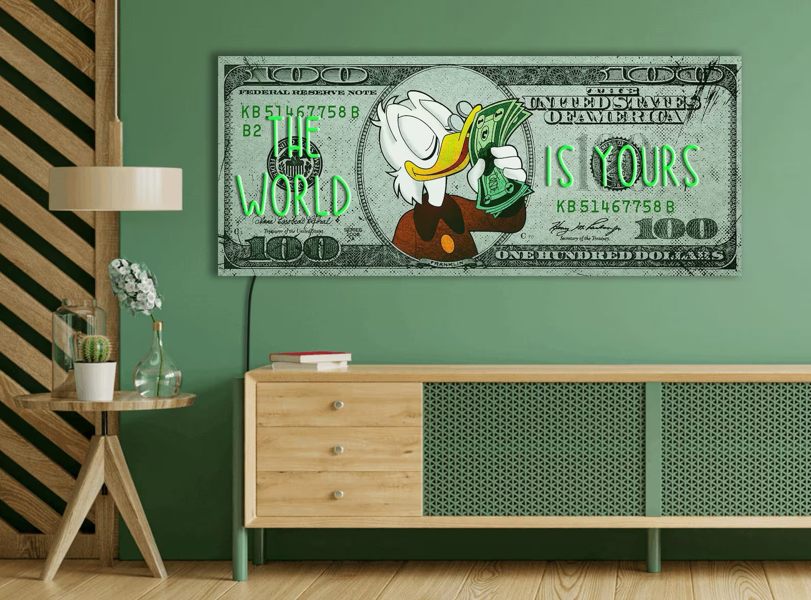 Bring a touch of luxury and creativity into your home with this exclusive neon artwork! With a design that blends modern style and irony, “The World Is Yours” is a one-of-a-kind decorative panel, inspired by American banknotes and enhanced with vibrant, customizable neon lighting. 💡✨